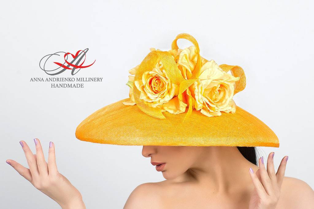 Желтая широкополая шляпа из синамей для скачек с цветами "Лучистая"